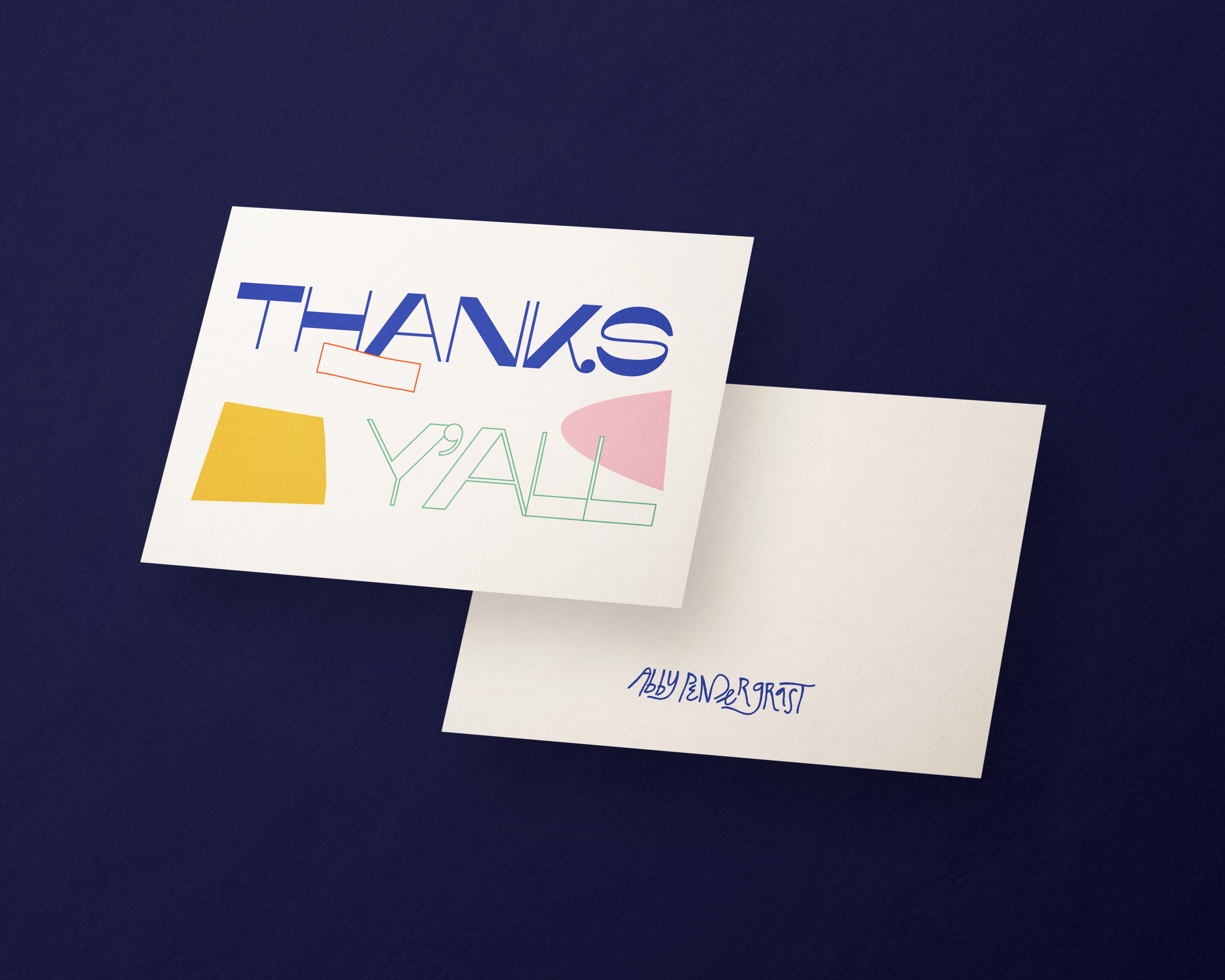Abby wanted to include a special printed note to send along when folks purchased a pillow, so I designed a card that could be slid into the package with the pillow when it was shipped to a customer. Abby ended up selling her pillows at her friend's local shop, Bonita Bodega, and these thank-you notes were handed to customers who purchased them.